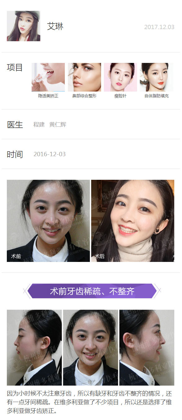 艾琳在我院做了多个项目,隐形牙齿矫正,鼻部综合整形,注射瘦脸针,自体脂肪填充,这四个项目完全做到了她对未来自己的预期。